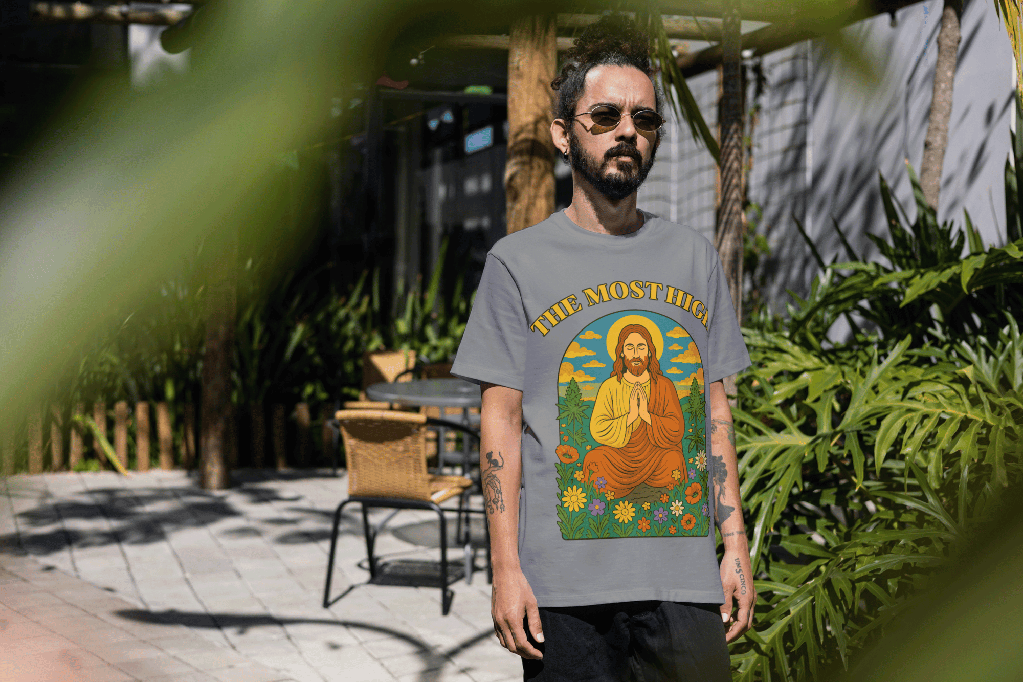 Elevate your energy and your style with the Most High Afro Meditate Tee. This exclusive design features a powerful image of a man meditating in a vibrant field, surrounded by wildflowers and two iconic cannabis plants—a bold celebration of mindfulness, faith, and the beauty of natural consciousness.